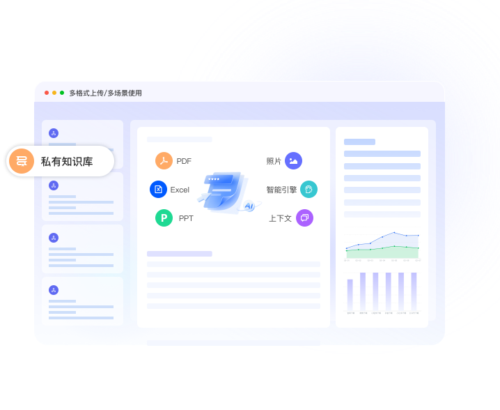 · 私有知识库:TB级存储,支持PDF/Excel/PPT等多格式上传,自动构建企业问答库。