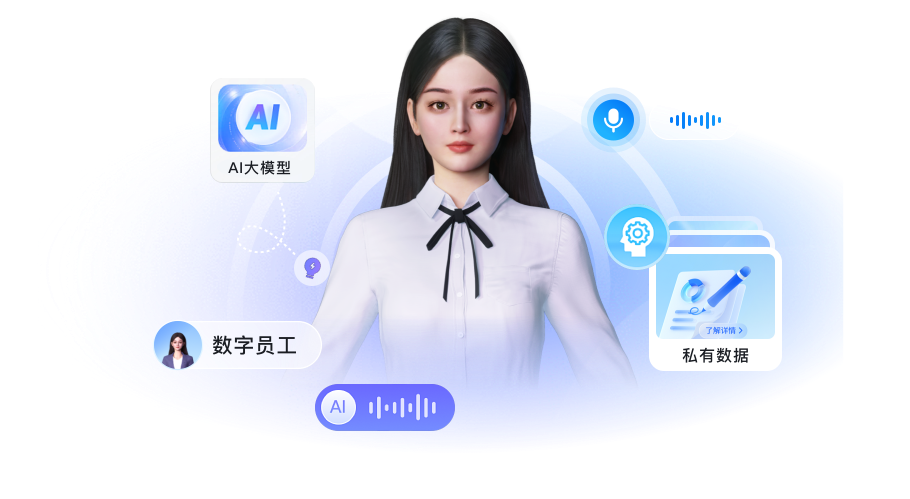 · 高保真3D数字形象:替代真人完成业务咨询,数据分析等服务。同时打造具备亲切感与专业度的数字员工形象,支持形象个性化定制。